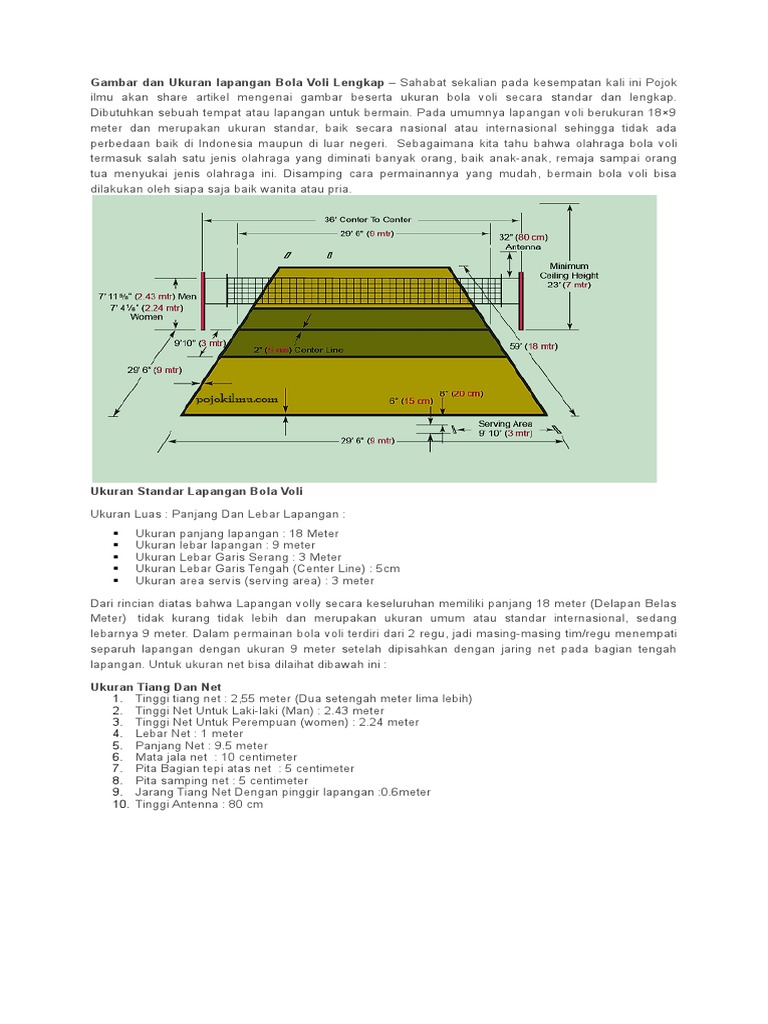 Dalam permaianan bola voli satu tim terdiri dari 12 pemain satu coach. Jadi tidak ada perbedaan sama sekali antara ukuran lapangan bola voli di indonesia dan di luar negeri. Permainan bola voli sudah menyebar luas di indonesia bahkan di dunia. Gambar lapangan bola voli beserta ukuran dan keterangannya. Ukuran lapangan voli juga memiliki standar tersendiri, contohnya.